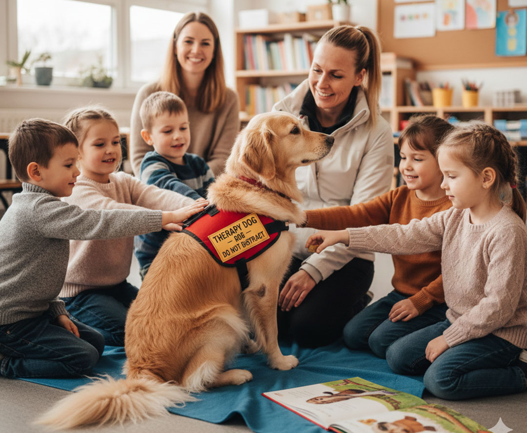 Mit therapeutisch ausgebildeten Hunden und unserer langjährigen Erfahrung begleiten wir die Kinder dabei, Vertrauen aufzubauen und angemessenes Verhalten zu üben. Ziel ist es, eine Brücke des Verständnisses zwischen Kind und Hund zu schaffen.